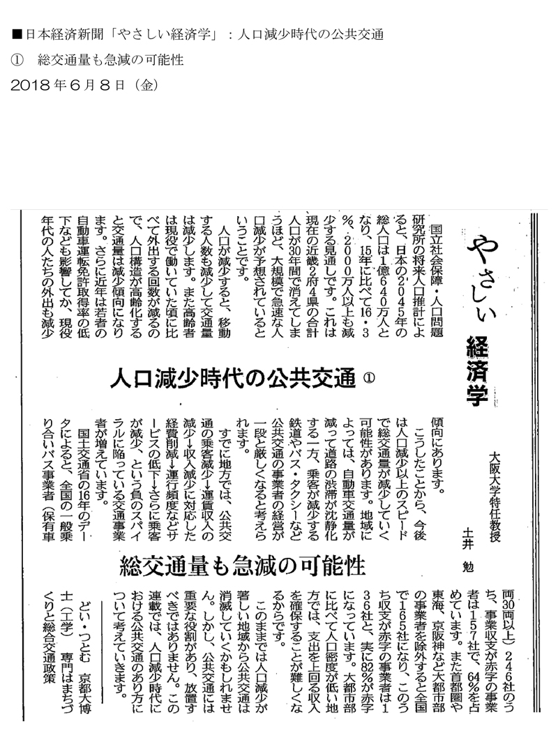 しかし、人口減少社会の到来により地域公共交通のサービスを企業が提供し続けることは極めて厳しくなることが目に見えています。たまたま日本経済新聞の編集者の方から、「やさしい経済学」において人口減少社会における公共交通のあり方について書くことを依頼されました。