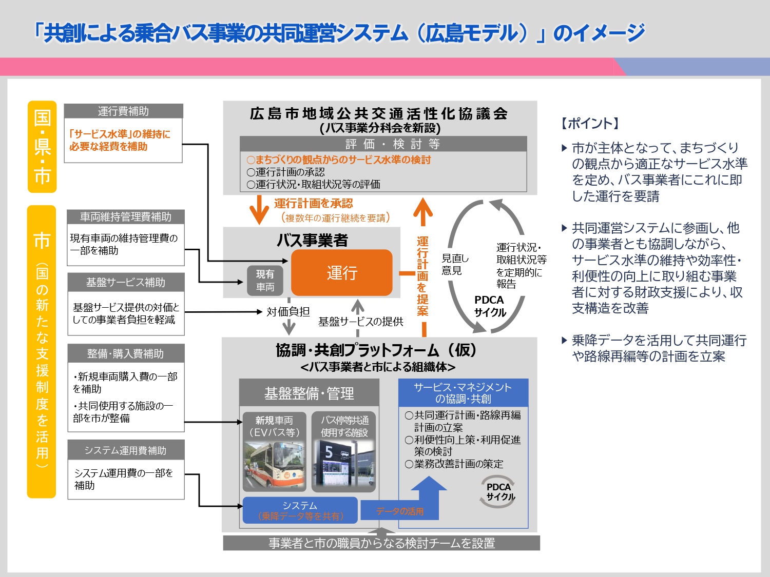 一つ目の維持方策については、現在広島市において乗合バスの「共創による乗合バス事業の共同運営システム(広島モデル)」の構築が検討されている。(別紙参照)